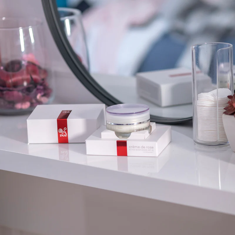 Crème de rose от InaEssentials е хидратиращ дневен крем за лице с SPF 30, обогатен с органично розово масло и розова вода, който интензивно хидратира, успокоява и защитава кожата от вредното влияние на UV лъчите. Мултифункционалната му формула създава деликатен защитен филм, който предпазва от дехидратация, преждевременно стареене и слънчеви алергии, като същевременно подобрява еластичността и плътността на кожата.
