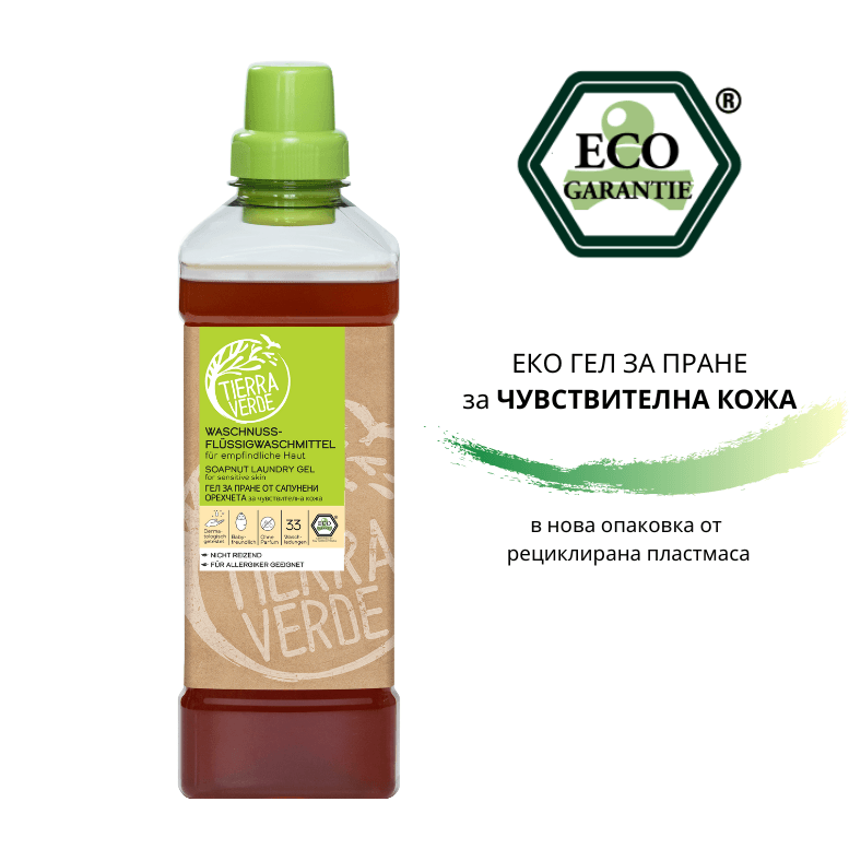 Гел за пране от сапунени орехчета за чувствителна кожа за 33 пранета. Концентриран, натурален препарат за фино и екологично пране на бебешки дрешки и текстил за хора с чувствителна кожа. Подходящ за пране на цветни дрехи, текстилни пелени и дрехи от полар.