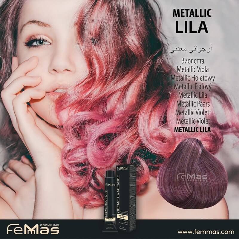 FemMas Метален лилав е професионална немска крем боя за коса с иновативна технология Балансирана система за формулиране, осигуряваща наситен, дълготраен и равномерен цвят без дразнене на скалпа.