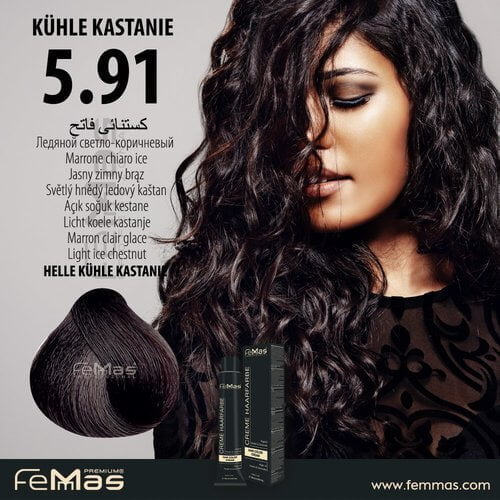 Боя за коса FemMas светъл хладен кестен 5.91 е професионална немска крем боя за коса с иновативна технология Балансирана система за формулиране, която осигурява естествено светъл кестенов оттенък с хладен нюанс, дълготраен цвят и защита на скалпа.