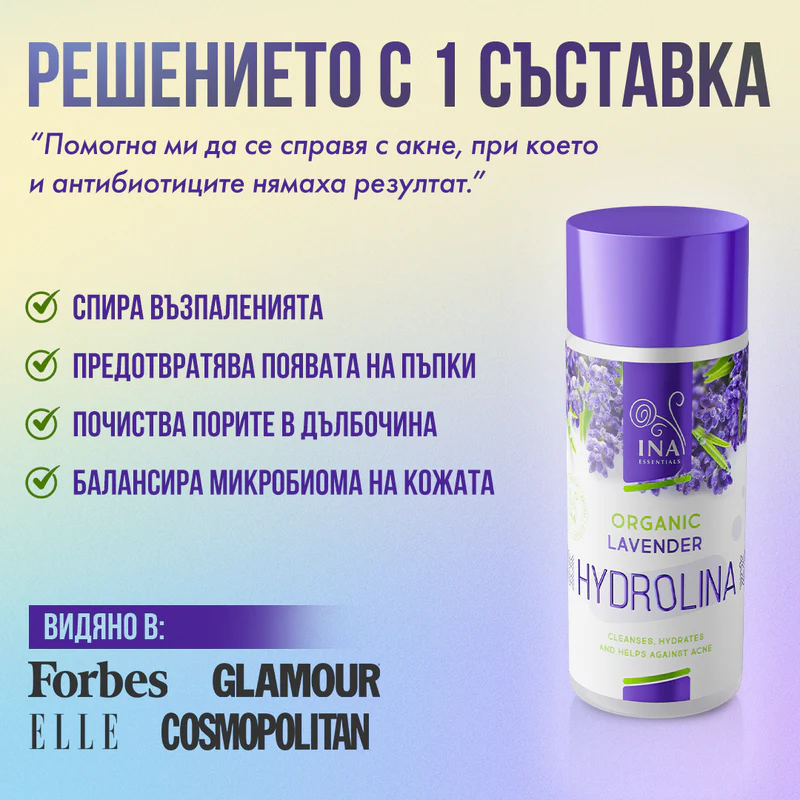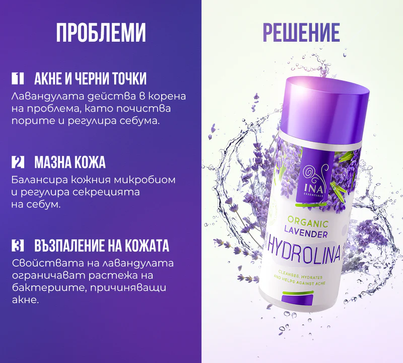 Преобразете кожата си с Био Лавандулова Вода – Hydrolina при Акне – нашият природен отговор срещу акне и черни точки. Подходяща за нормална, смесена и мазна кожа, осигурява чиста, здрава и сияйна кожа.