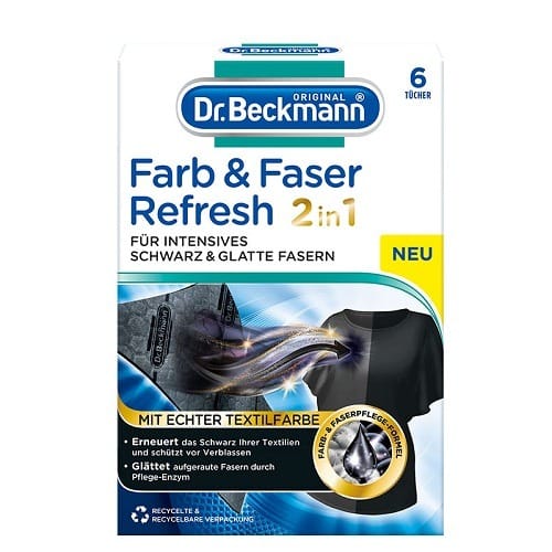 Dr. Beckmann Кърпички за тъмно пране и освежаване на влакната се грижат за възстановяването и защитата на цвета на тъмните дрехи при пране. Старите дрехи изглеждат като нови с минимални усилия. Специалната формула с висококачествен черен пигмент се свързва с тъканите по време на пране и предотвратява избледняването. Едновременно с това, специалните ензими регенерират захабената тъкан, като изглаждат и предотвратяват появата на малки мъхести топчета.