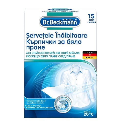Dr. Beckmann Кърпички за бяло пране възвръщат яркостта на белите дрехи след пране.