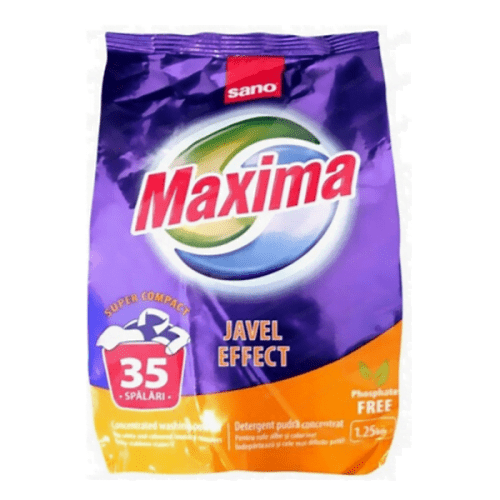Sano Maxima Javel Прах за 35 пранета е концентриран прах за пране, подходящ за всички видове тъкани, за автоматично и ръчно пране. Препаратът е ефективен при упорити петна и освежава цветните материи, като същевременно поддържа качеството на тъканите.