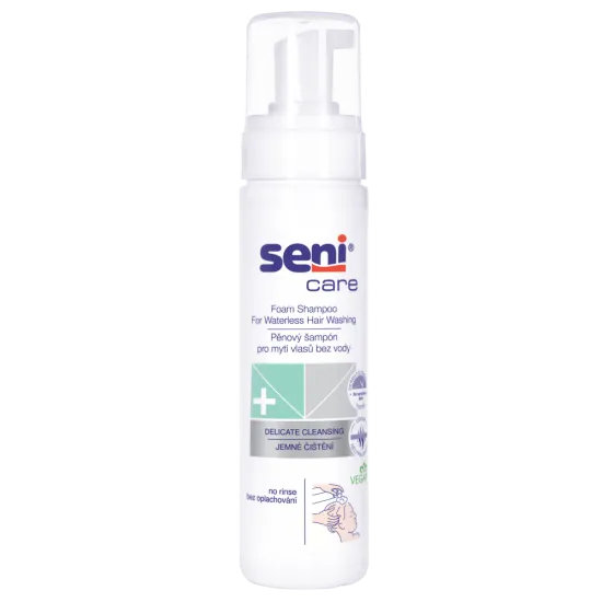 SENI Пяна шампоан за сухо къпане е иновативен продукт за деликатна и ефективна хигиена на косата и скалпа без нужда от вода и изплакване. Специално създаден за хора с ограничена подвижност, лежащо болни или пациенти в болнични и домашни условия, този шампоан-пяна осигурява свежест, чистота и комфорт по всяко време.